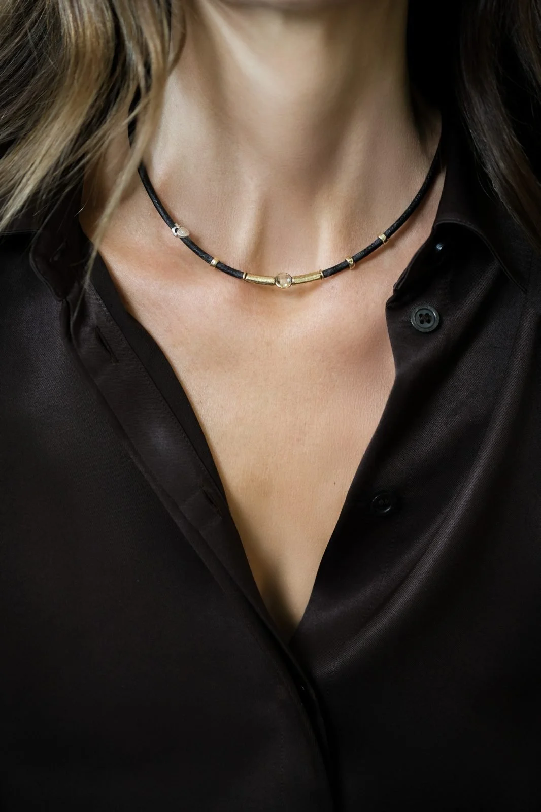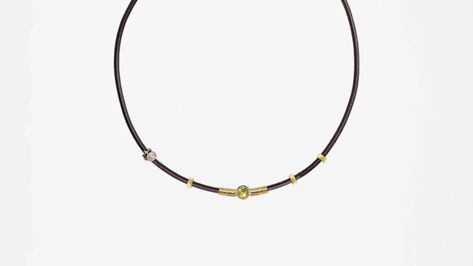 A contemporary expression of Italian craftsmanship. This Misani Milano necklace is handcrafted in Italy from 3 mm Tuscan leather and features an 18 karat yellow gold cylinder paired with faceted green quartz. Gold and sterling silver elements add subtle contrast, creating a refined composition that reflects Misani’s signature balance of strength, elegance, and understated luxury.